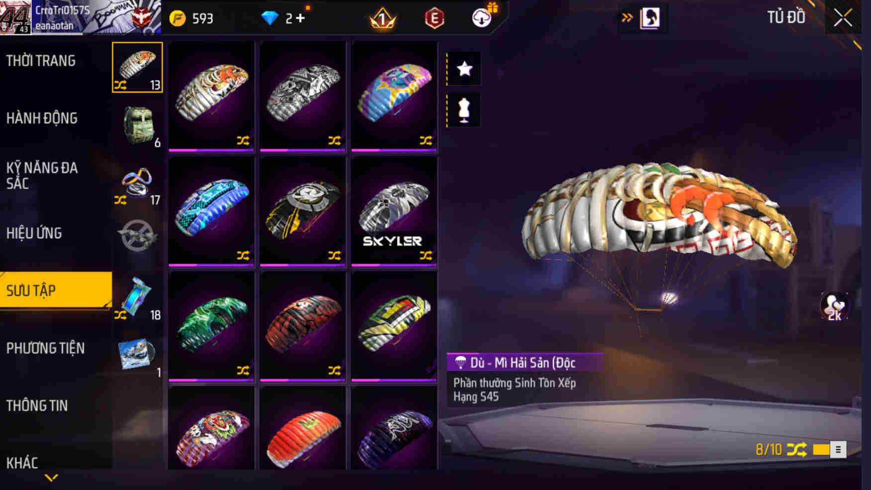 - Skin: Nhiều skin súng, balo, thời trang, dù, kho đồ nhiều vật phẩm giá trị…